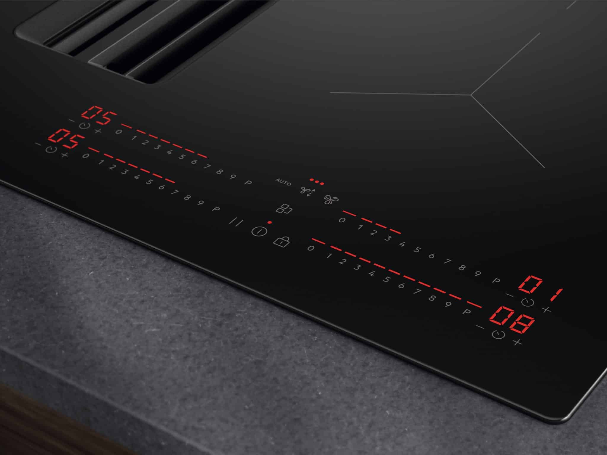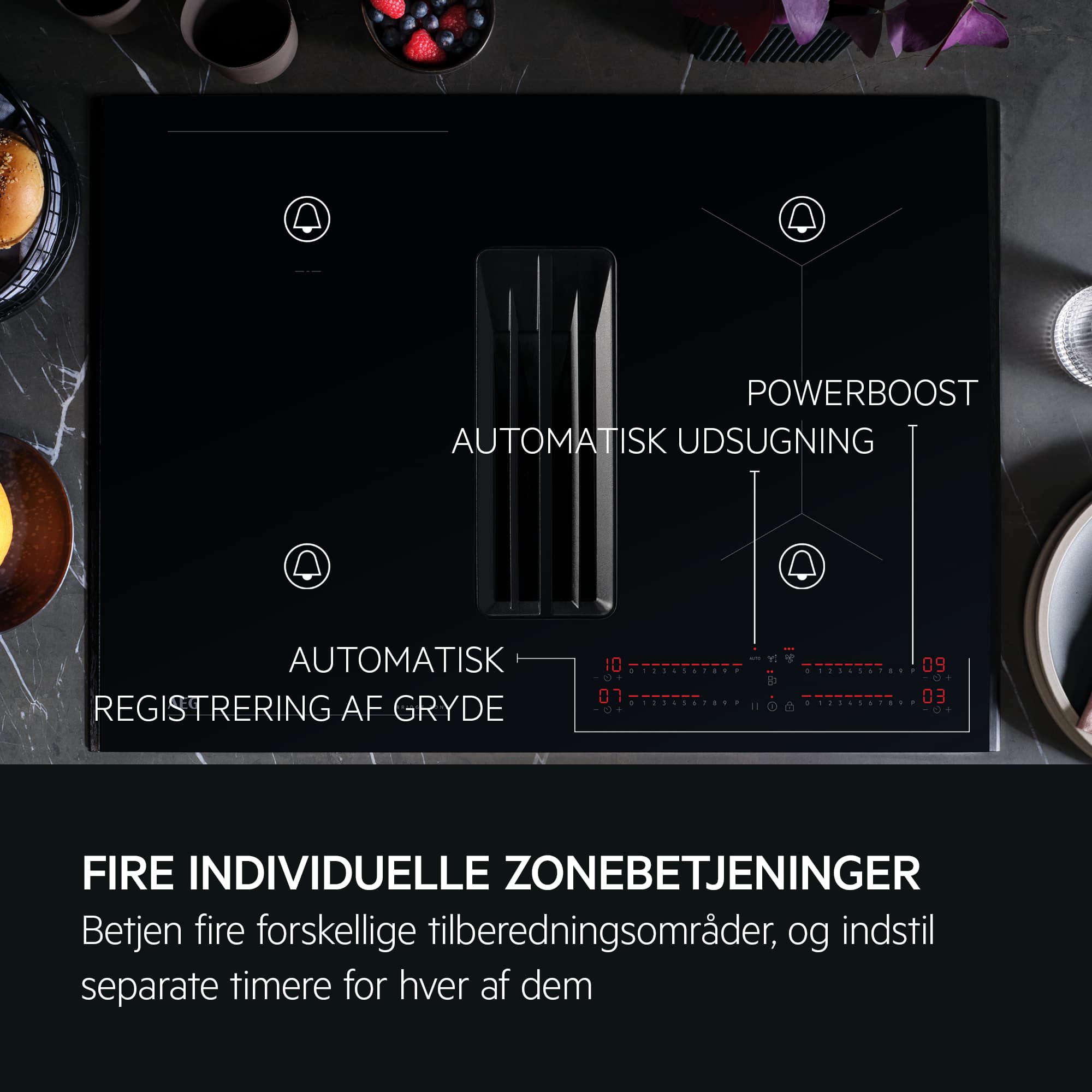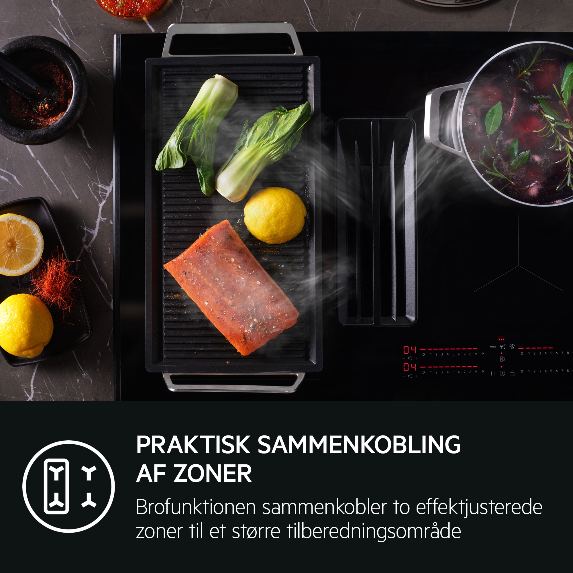 70 cm induktionskogeplade med integreret emhætte og Bridge-funktion – den perfekte kombi for effektiv og pladsbesparende madlavning.