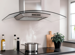 Lodret køkkenemhætte til vægmontering, lavet af rustfrit stål med sort glas, tre hastigheder plus boost-funktion, energibesparende LED-belysning og mulighed for kulfiltertilbehør. Læs hele beskrivelsen