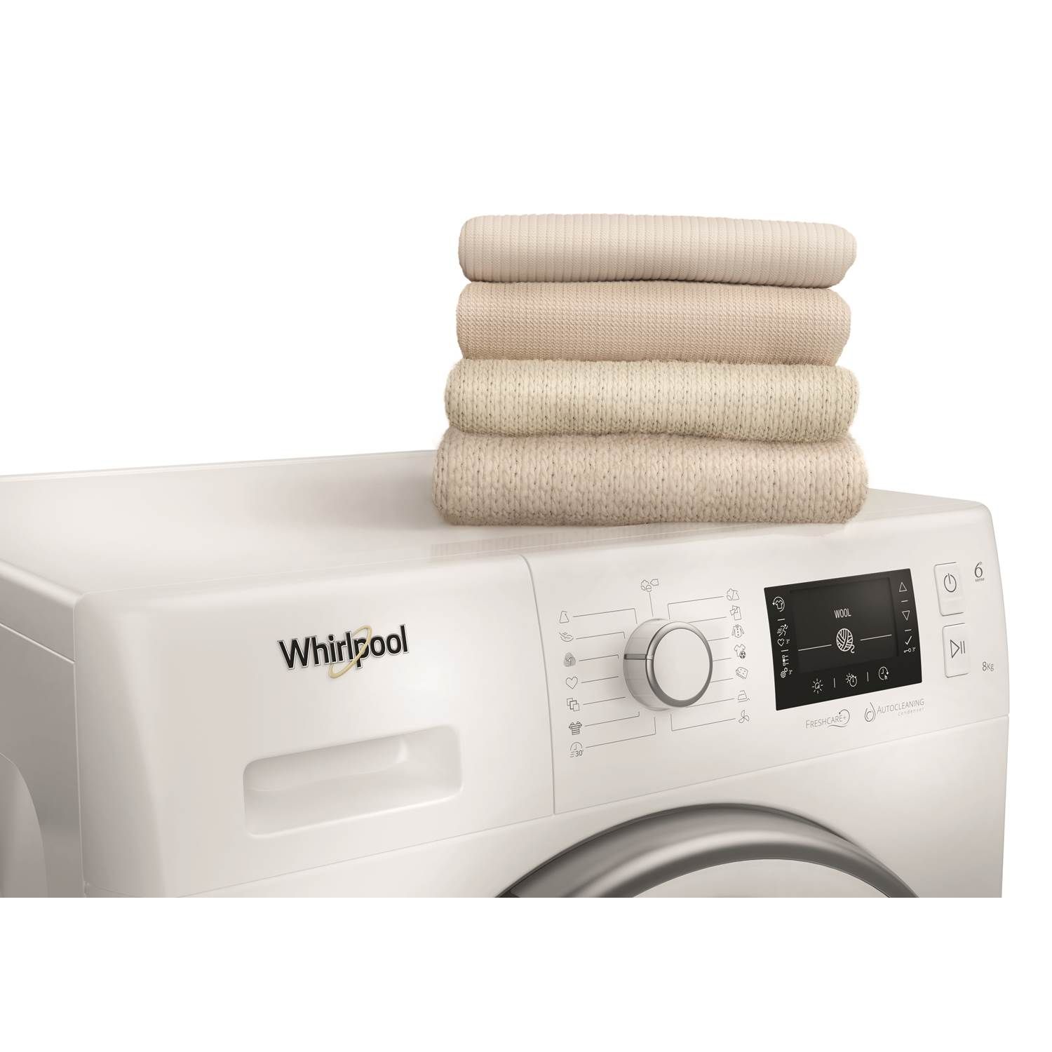 Whirlpools Precision Dry-teknologi, drevet af 6th Sense, justerer automatisk vaskeprogrammet ved at registrere fugtigheds- og temperaturniveauer for at forhindre overtørring.